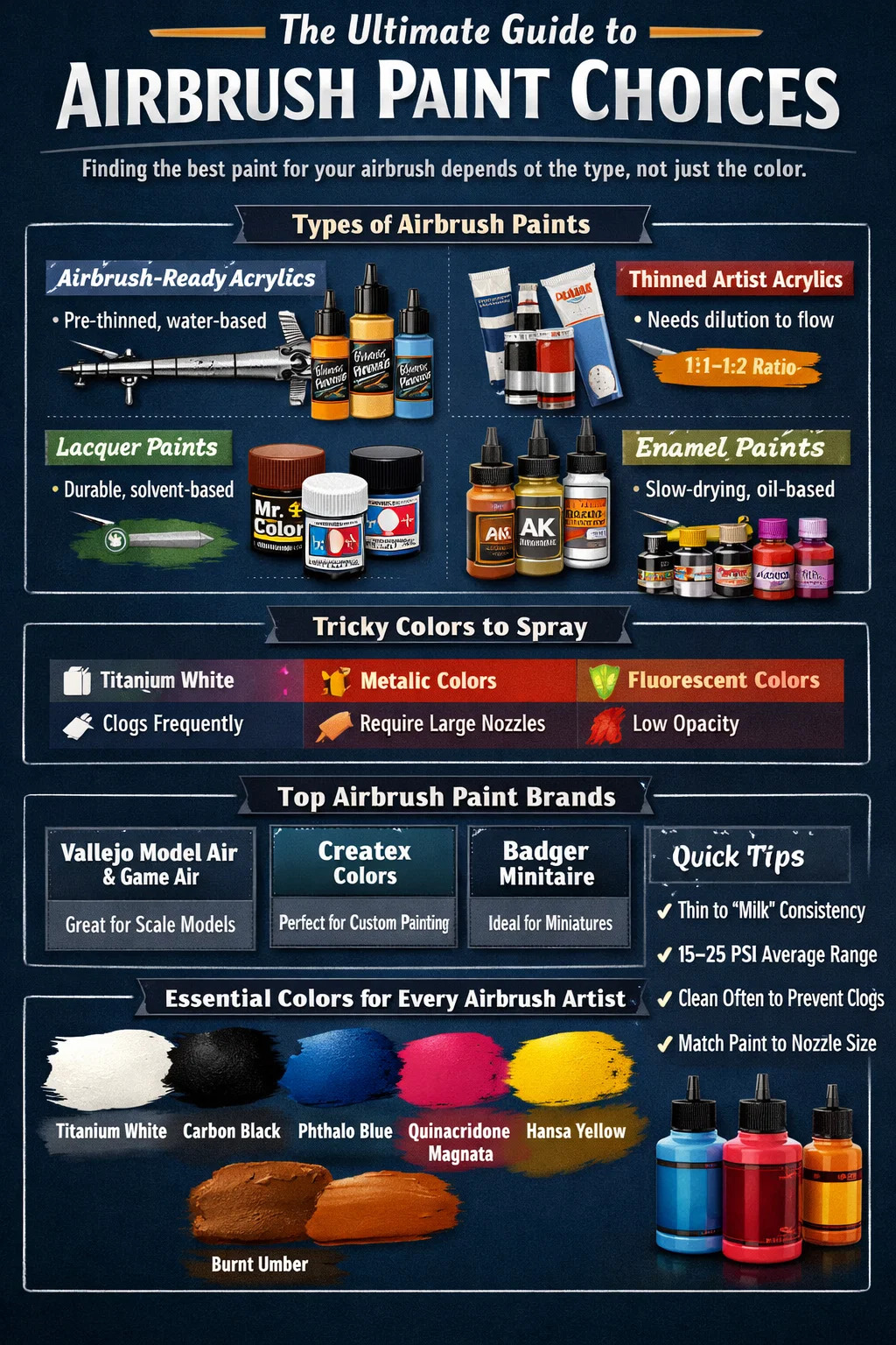 Jos haluat suoran vastauksen ilman kiertoteitä - airbrush-valmiit akryylimaalit ovat paras valinta useimmille airbrush-käyttäjille , maalaatpa pienoismalleja, mukautettuja tennareita, kakkutaidetta, vartalomaalausta tai taidekankaita. Ne ovat vesipohjaisia, myrkyttömiä, nopeasti kuivuvia, ja niissä on tarpeeksi hienoja pigmenttihiukkasia, jotta ne voivat virrata airbrush-suuttimien läpi tukkeutumatta. Tuotemerkit, kuten Vallejo, Createx ja Badger Minitaire, johtavat tässä kategoriassa hyvästä syystä.
