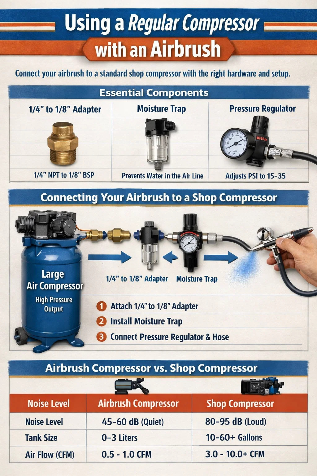 Tavallisen kompressorin suurin haittapuoli on melu. Jos käytät airbrush-tekniikkaa pienessä huoneessa tai asunnossa, 5 gallonan myymäläkompressorin voimakas käynnistys voi olla häiritsevää. Koska näissä kompressoreissa on suuret säiliöt, voit kuitenkin usein täytä säiliö kerran ja sammuta sitten moottori, jolloin voit käyttää airbrushia täydellisessä hiljaisuudessa 20–30 minuuttia käyttämällä vain varastoitua ilmaa.