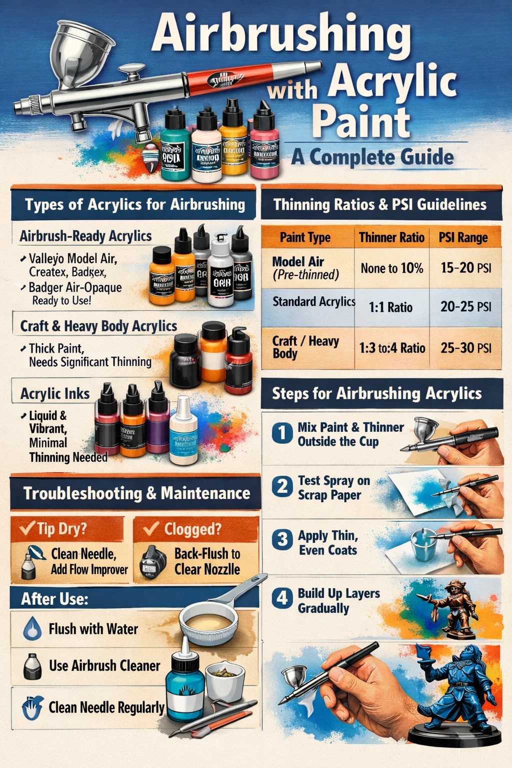 Akryylit kuivuvat muovimaiseksi kalvoksi, joka on vedenpitävä kovettuessaan. Tämä puhdistaa airbrushin heti käytön jälkeen ei neuvoteltavissa.