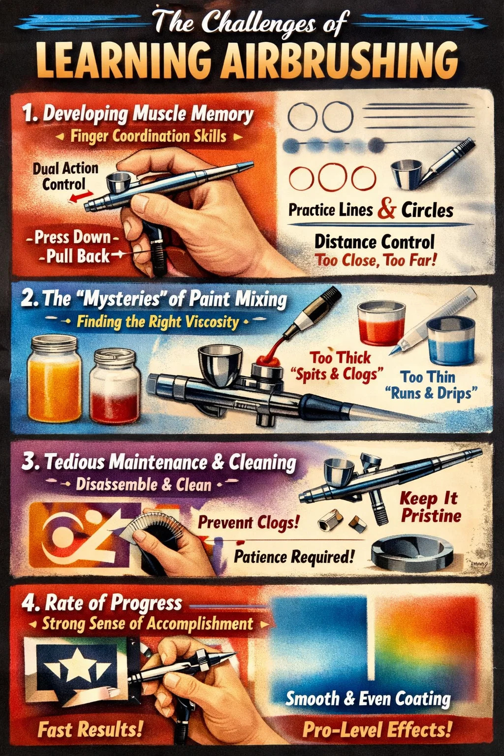 Tässä on joitain käytännön näkökohtia airbrushin oppimisen vaikeudesta: